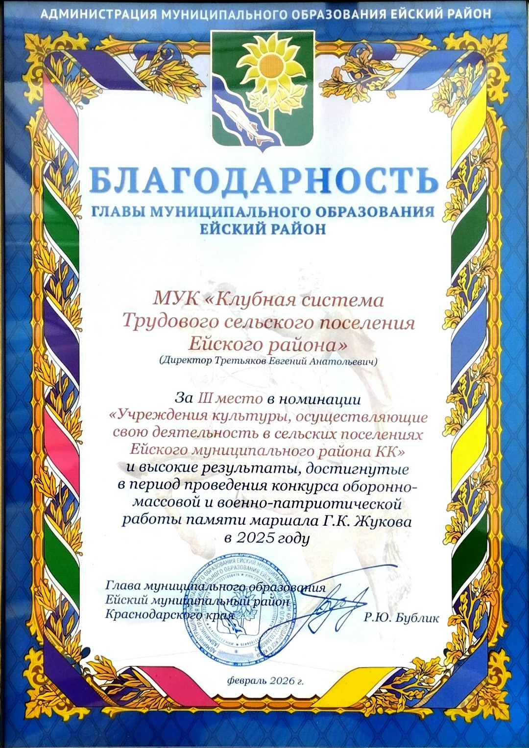 Почетные гости от лица главы МО Ейский район Романа Юрьевича Бублика вручили благодарность директору МУК «КС Трудового сельского поселения» Е. А. Третьякову за 3 место районного этапа конкурса оборонно-массовой и военно-патриотической работы памяти маршала Г. К. Жукова в номинации «Учреждения культуры,осуществляющие свою деятельность в сельских поселениях Ейского муниципального района КК».